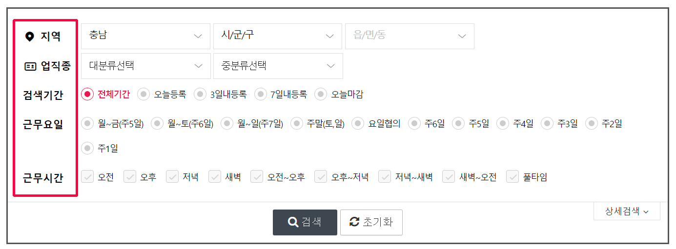 근무요일, 근무시간을 설정해 가면서 구인정보를 입맛에 맞게 검색할 수 있습니다.