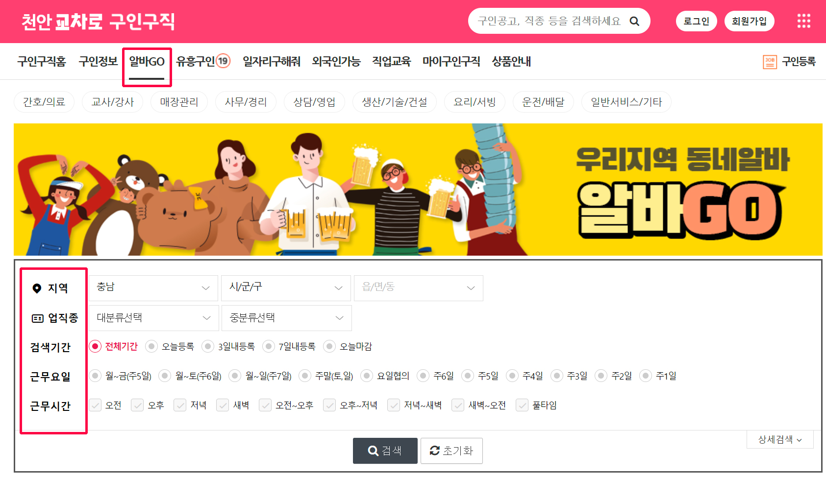 천안에서 아르바이트를 찾으시려면 상단 탭의 '알바 GO' 메뉴로 이동하셔서